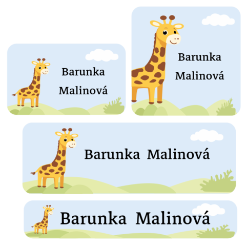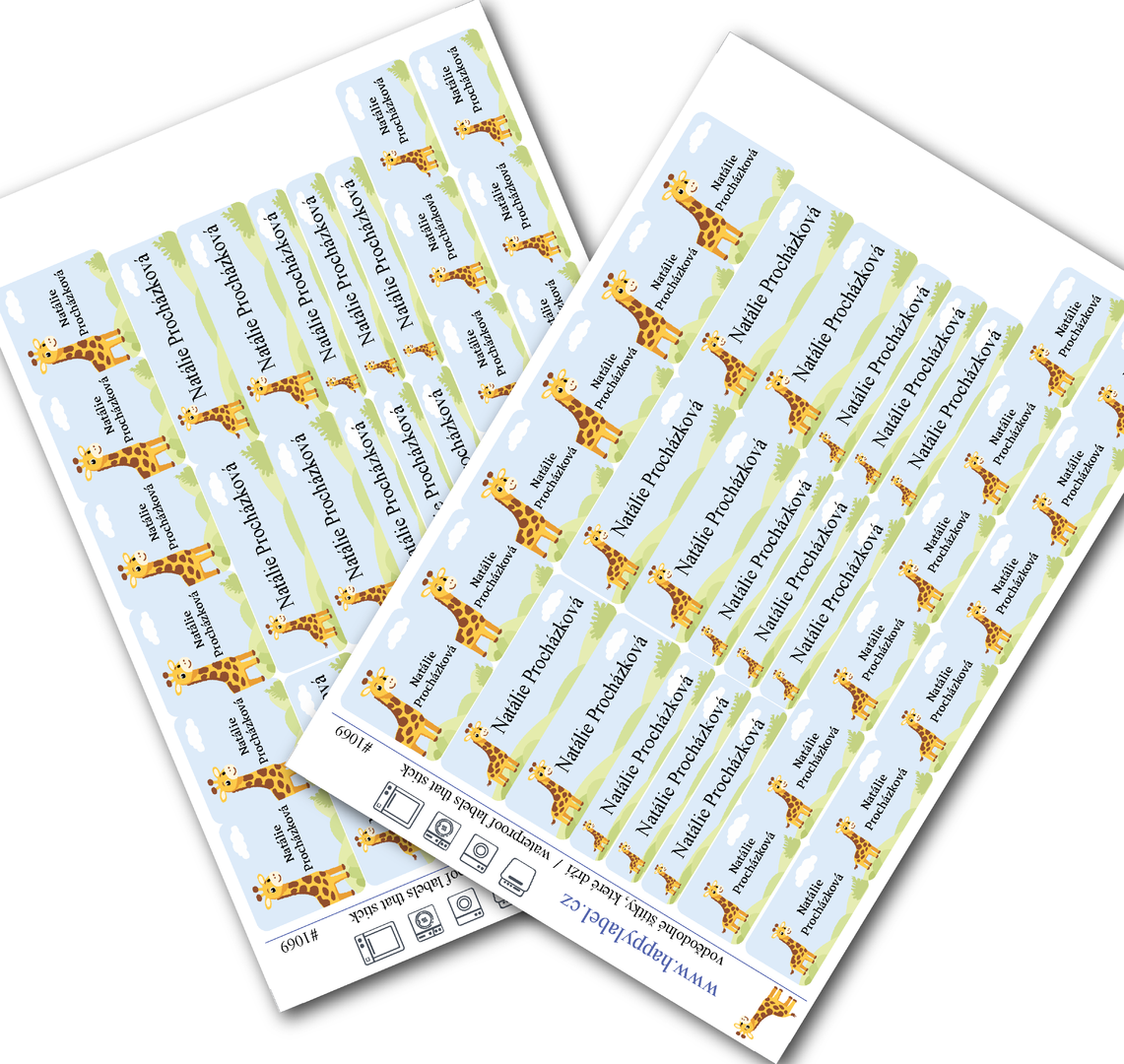 Naše žirafové štítky přinášejí do každého dne kousek radosti a hravosti. Jemný, milý design s žirafou si děti zamilují na první pohled a jejich věci budou díky nim nepřehlédnutelné.